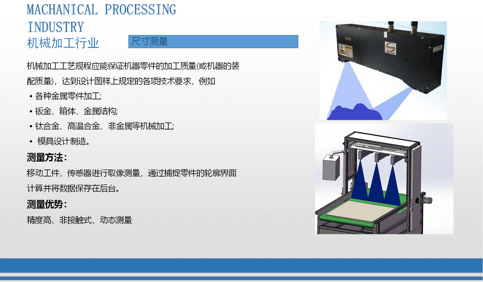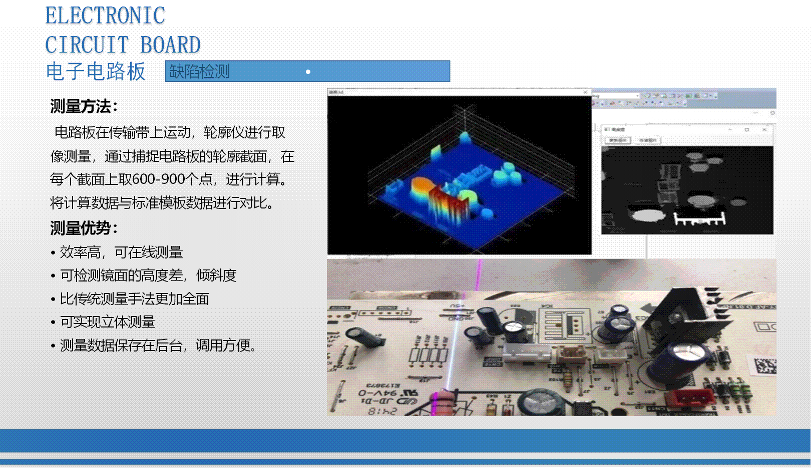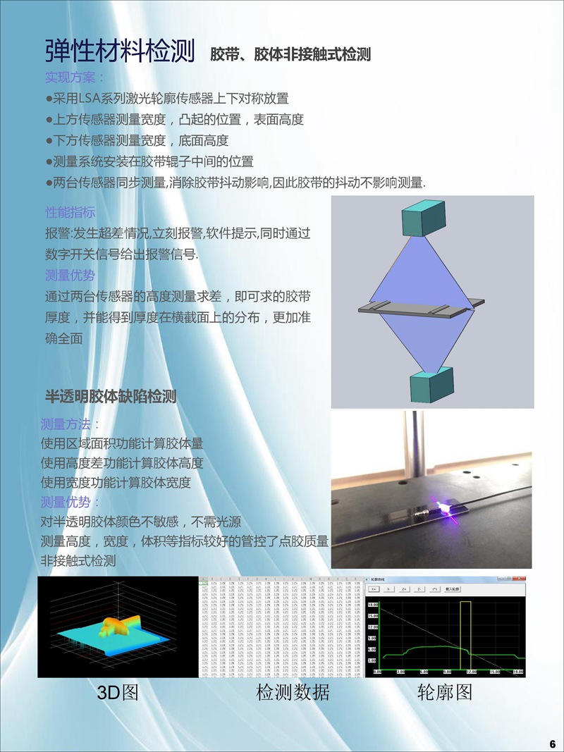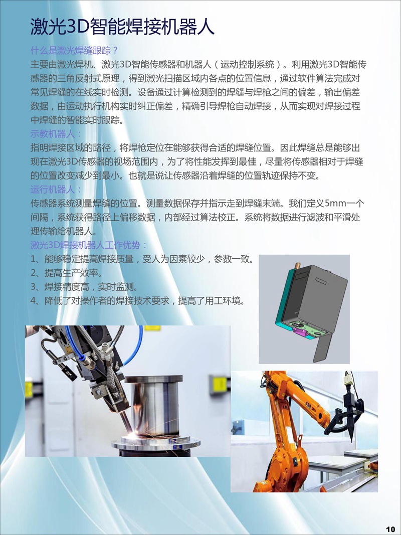 公司于2015年1月立項激光3D輪廓傳感器研發,2017年8成功開發激光3D智能傳感器,并進行各種輪廓檢測技術應用軟件與控制器開發、焊縫跟蹤系統應用開發、手持輪廓檢測儀開發。全系列產品于2018年8月均已成功上市,為廣大用戶提供量身定做的整套非接觸式智能精準測量方案。激光3D測量—非接觸式測量,可實現物體任一輪廓線尺寸測量,如高度差、寬度、角度、半徑、縫隙等,也可實現缺陷檢測、外觀尺寸掃描、表面特征跟蹤等功能。