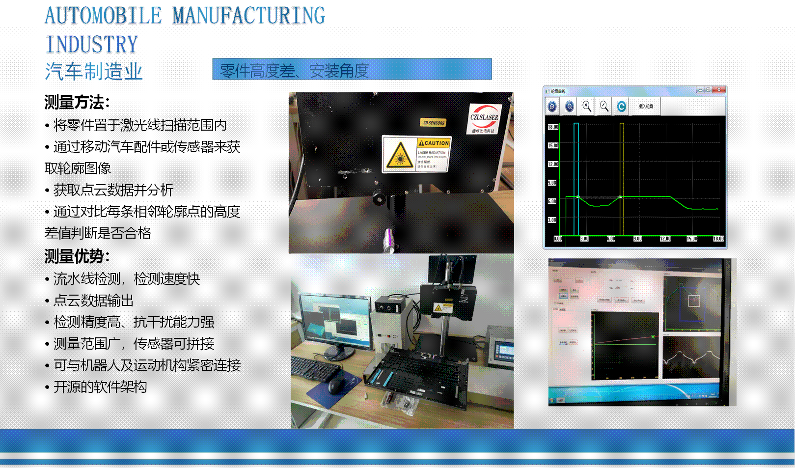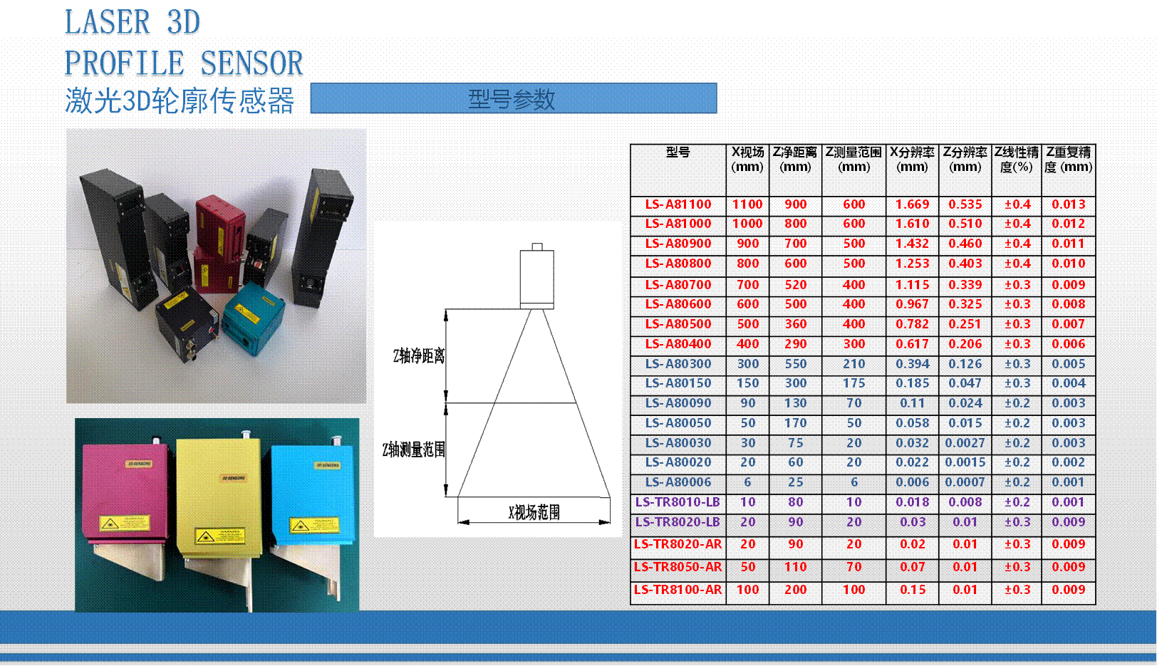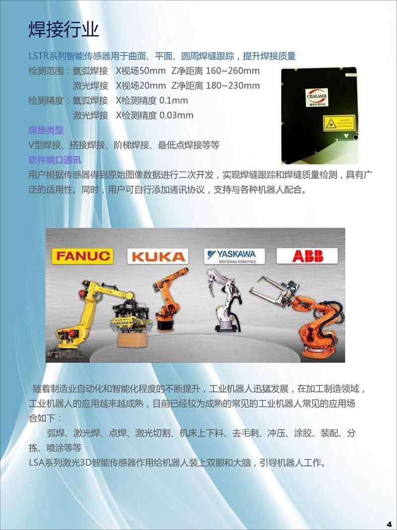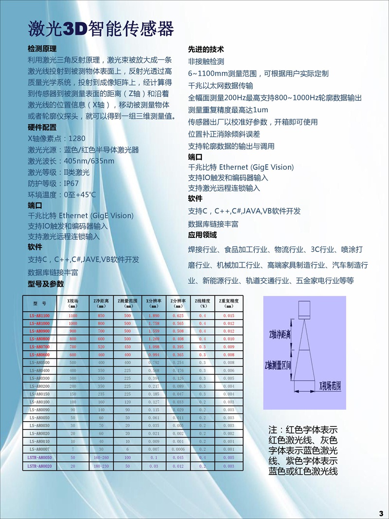 我司研發生產的3D輪廓傳感器注冊商標為:“CZLSLASER”,屬自主品牌,已有18個系列,藍光與紅光激光器,量程從6mm-1100mm,軟件通訊開放,可兼容任意通訊協議。可為客戶定制專用3D傳感器、定制專用軟件。
